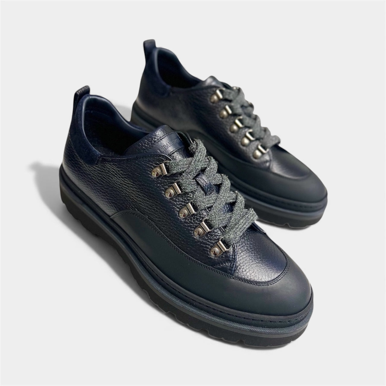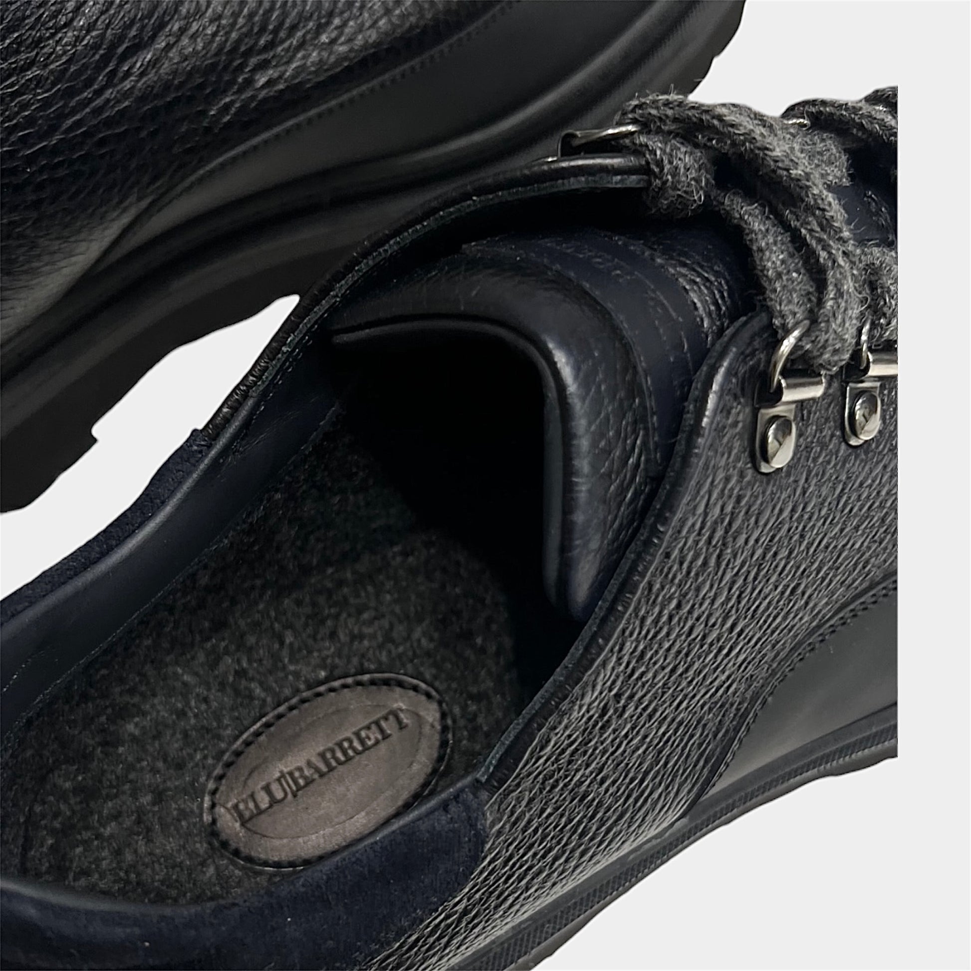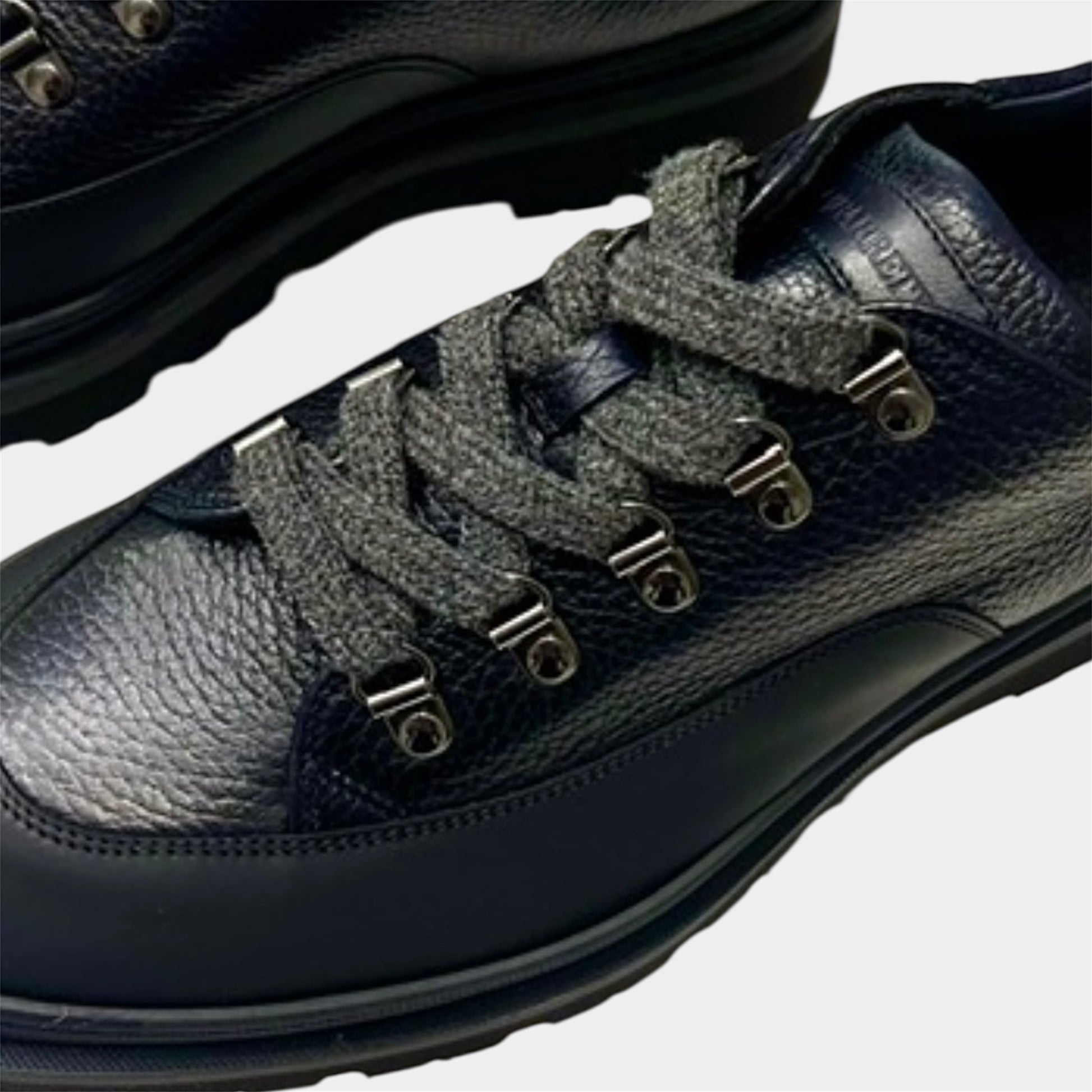 Чоловічі темно сині хайкери Blu Barrett з натуральної крупнозернистої оленьої шкіри. Модель створена для холодного сезону: рифлена неслизька підошва з сильним зчепленням, посилений мис і м’які кашемірові шнурки. Комфортні, теплі та преміальні за відчуттями.
