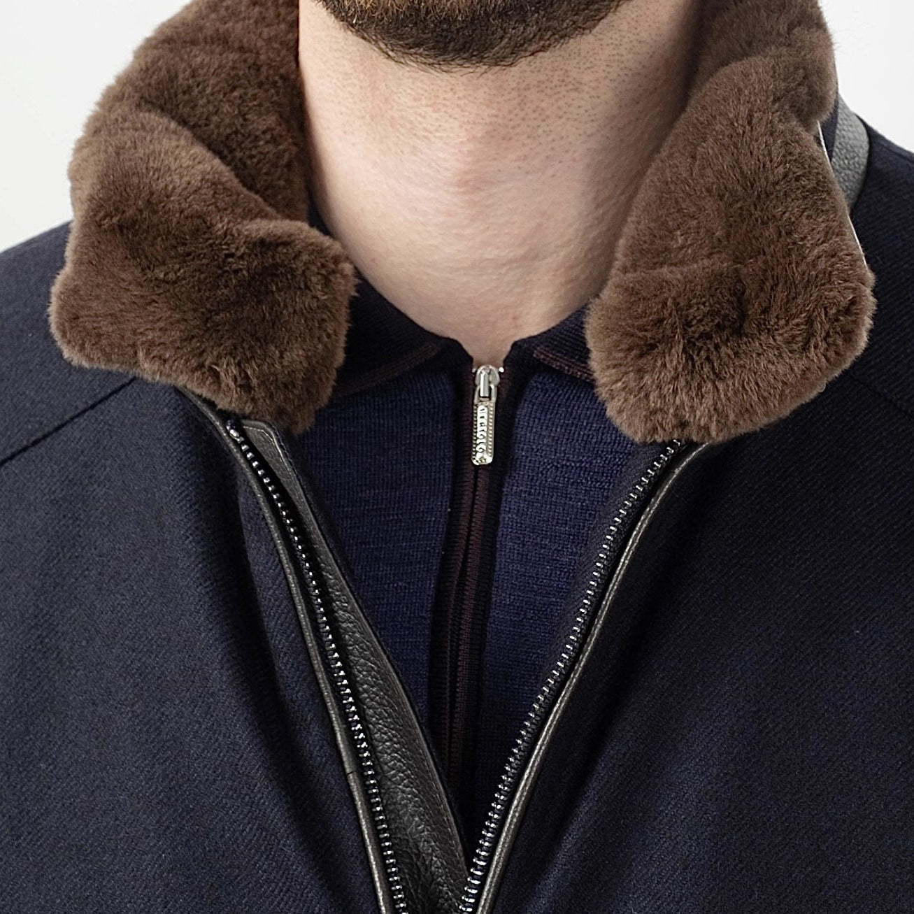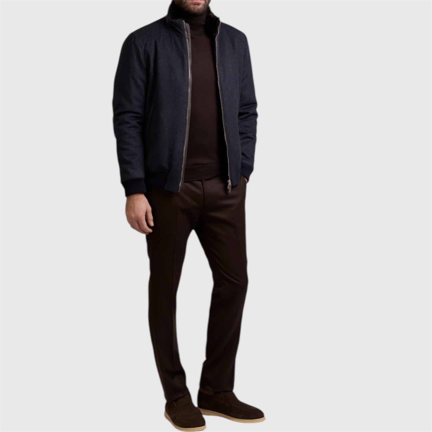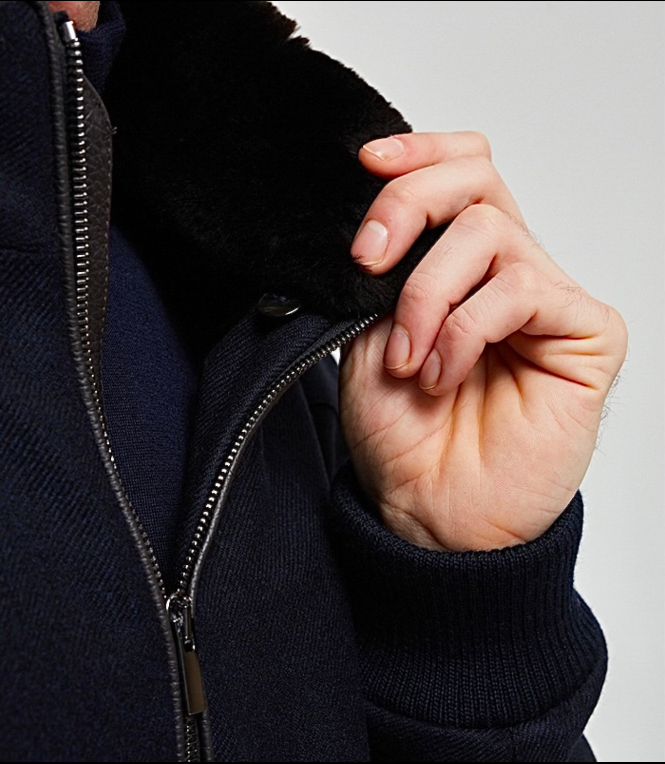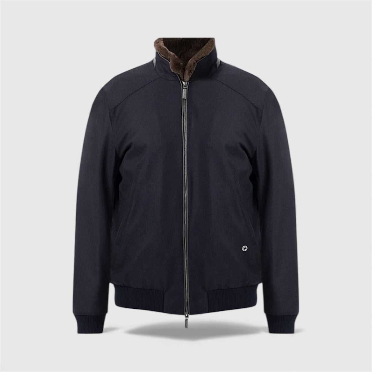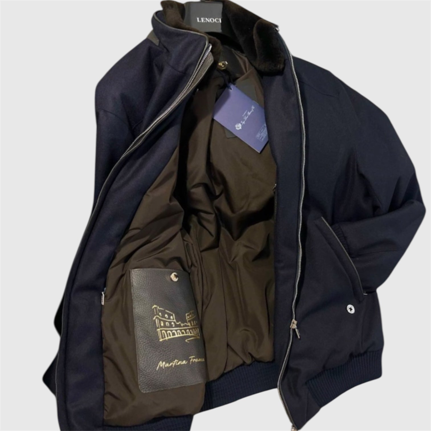 Бомбер італійського бренду LENOCI з вовни з кашеміром LORO PIANA STORM SISTEM, з водовідштовхувальною обробкою , комір з хутром, який відстібається.