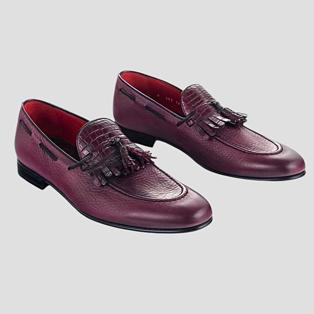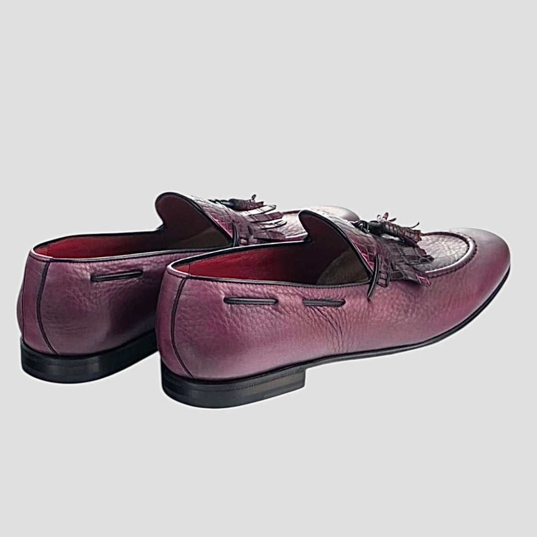 Вишукане поєднання фактур: м'яка шкіри оленя та акценти з натуральної крокодилової шкіри. Глибокий ягідний відтінок, декоративні пензлики та італійська ручна робота - для тих, хто цінує стиль і рідкісність.