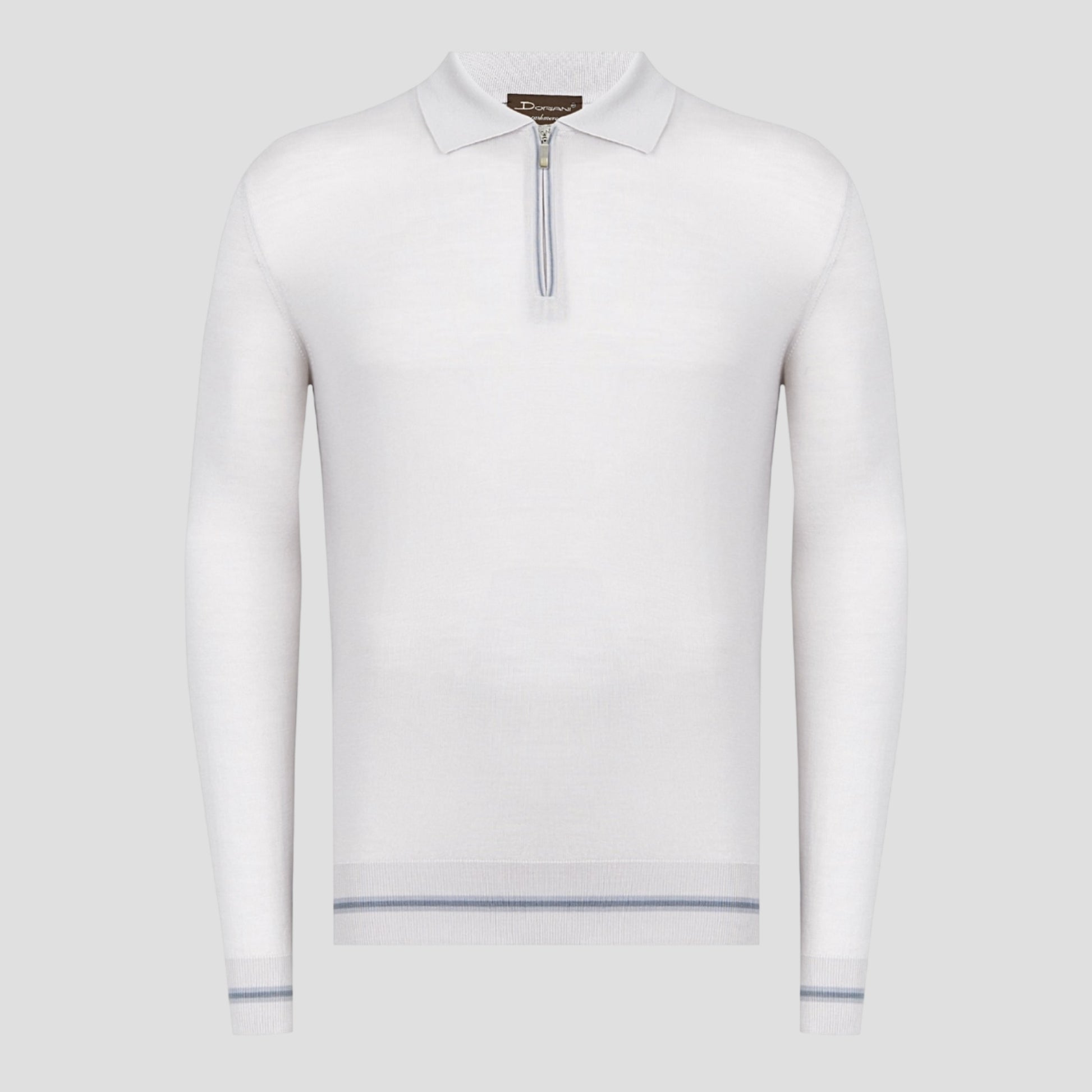 Дизайн на блискавці, обрамлений контрастними синіми смугами на манжетах, поясі і вздовж блискавки, що додає сучасної нотки та підкреслює унікальність виробу. Ця сорочка-поло від Doriani є справжнім прикладом неперевершеної якості Made in Italy і демонструє майстерність італійських ремісників. Вона стане центральним елементом вашого гардеробу, підкреслюючи вишуканий смак і увагу до деталей.