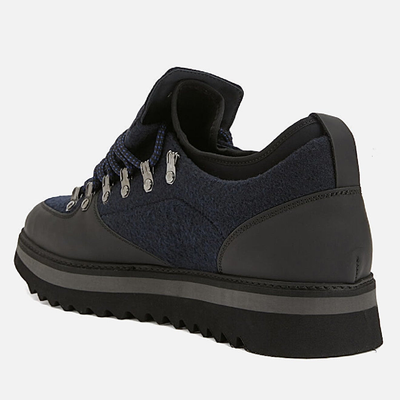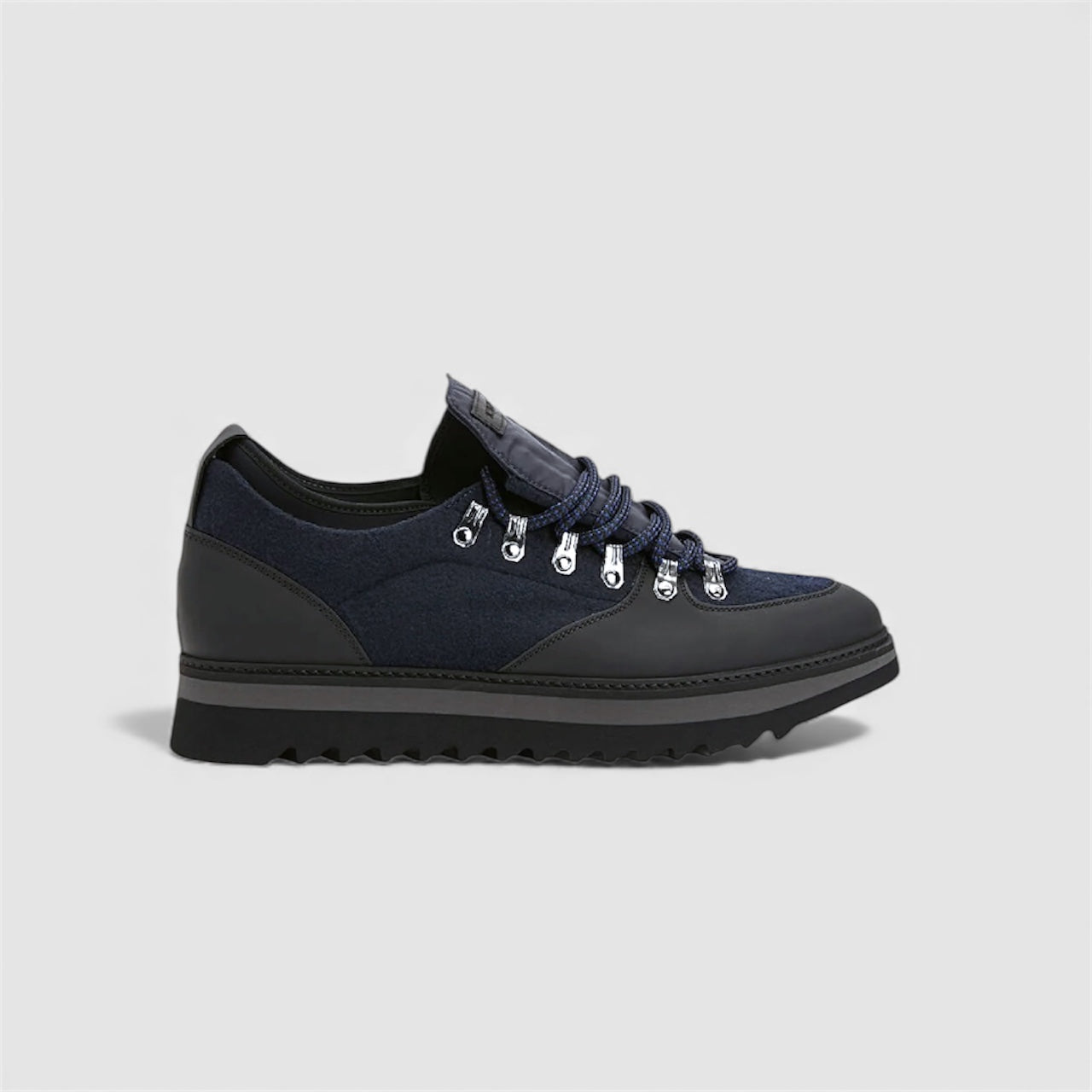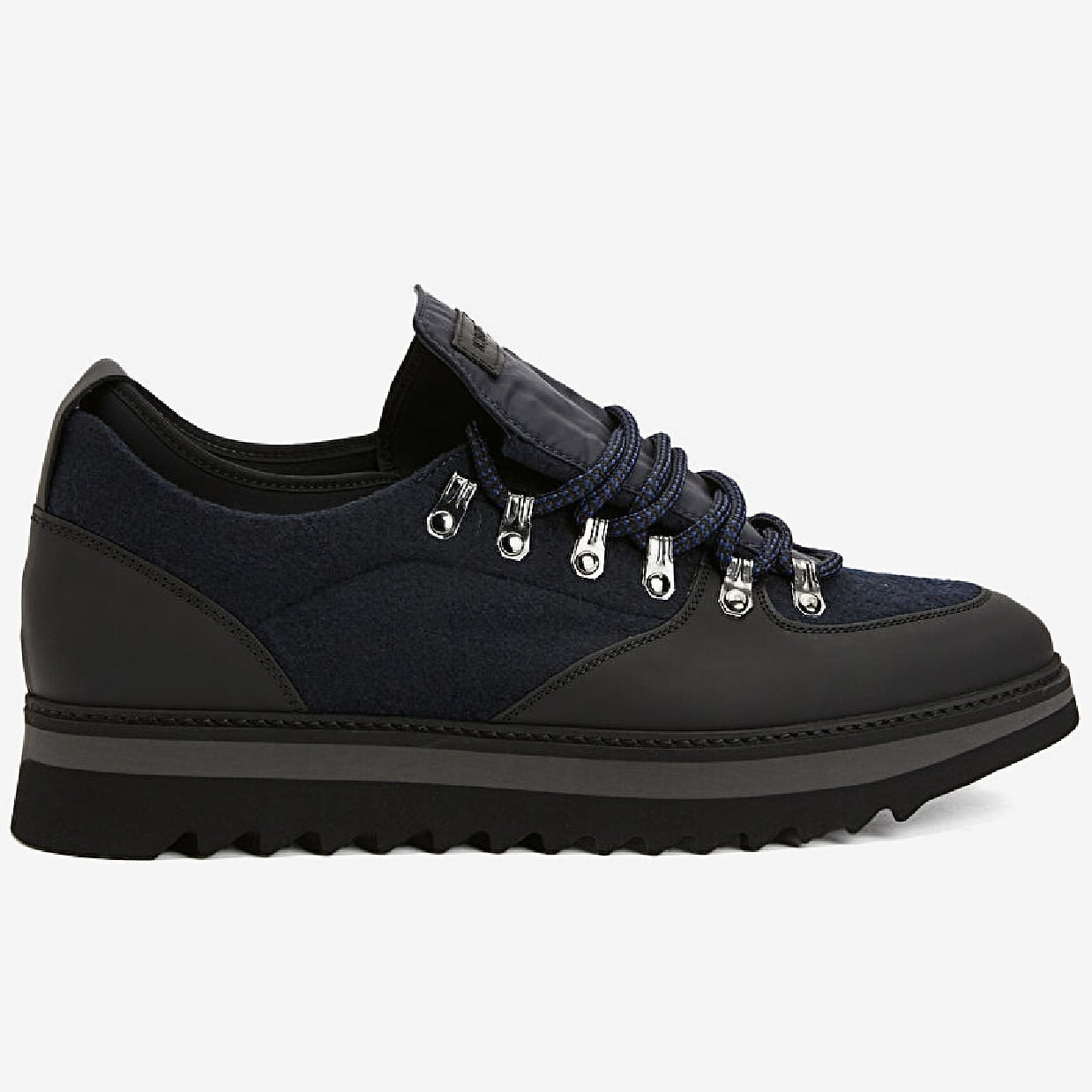 Для виготовлення кросівок «Megeve» використовували шерсть, зернисту і гладку прогумовану обробки. Модель із посиленою шнурівкою через D-подібні петлі на широкій, легкій підошві із стійким протектором. Текстильний язичок моделі прикрасили брендованим патчем.
